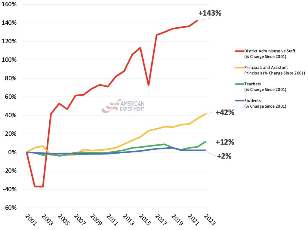 Over the last 20 years, Minnesota district hiring patterns have tended to prioritize non-teaching roles, and bureaucratic expansion is experiencing higher percentage growth compared to student enrollment growth patterns.