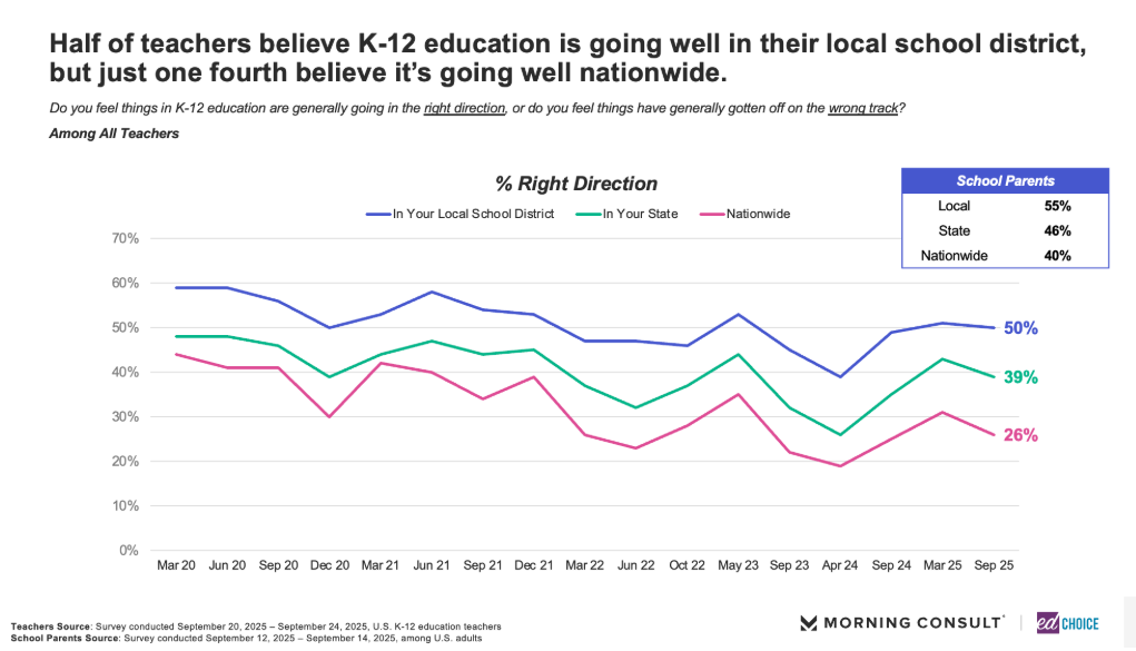 A September 2025 survey conducted by Morning Consult, in partnership with EdChoice, asked teachers the same question the survey has asked since 2020: “Do you believe that K-12 Education is going well?”