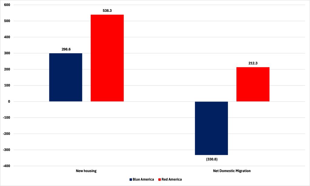 Figure 6 shows that, in 2024, Red America had a housebuilding rate — 538.3 per 100,000 residents — 1.8 times greater than Blue America, with 298.6. For domestic migration, Blue America lost 330.8 people per 100,000 residents in 2024 while Red America gained 212.3.