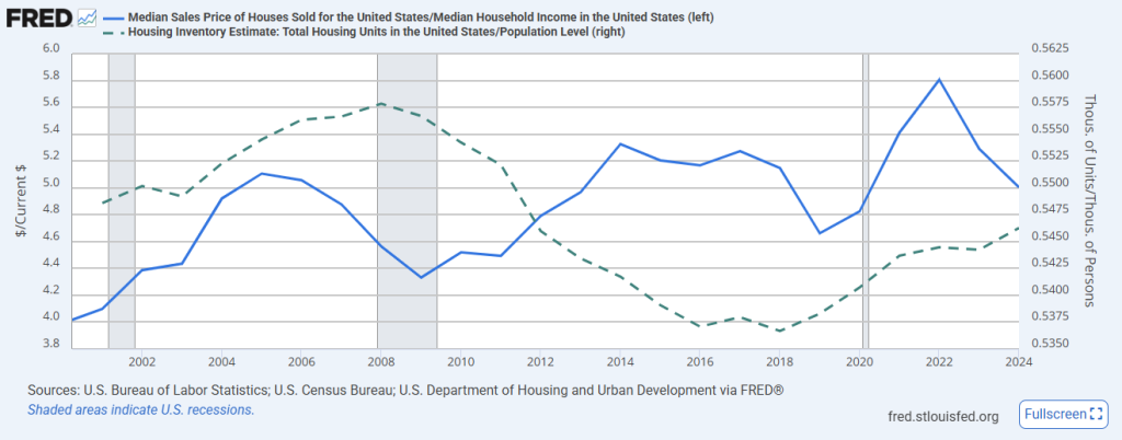 Econ 101 tells us that the rise in a price is driven by decrease in supply/increase in demand or some mix of both. A way to test this in housing is to look at the stock of it relative to the population. Indeed, Figure 2 shows that as house prices started to tick up as a multiple of household income from about 2001, the stock of housing in the United States responded, growing relative to the population, from 5.5 housing units per ten Americans in 2003 to 5.6 in 2008; “the cure for high prices is high prices,” as the old saying goes.
