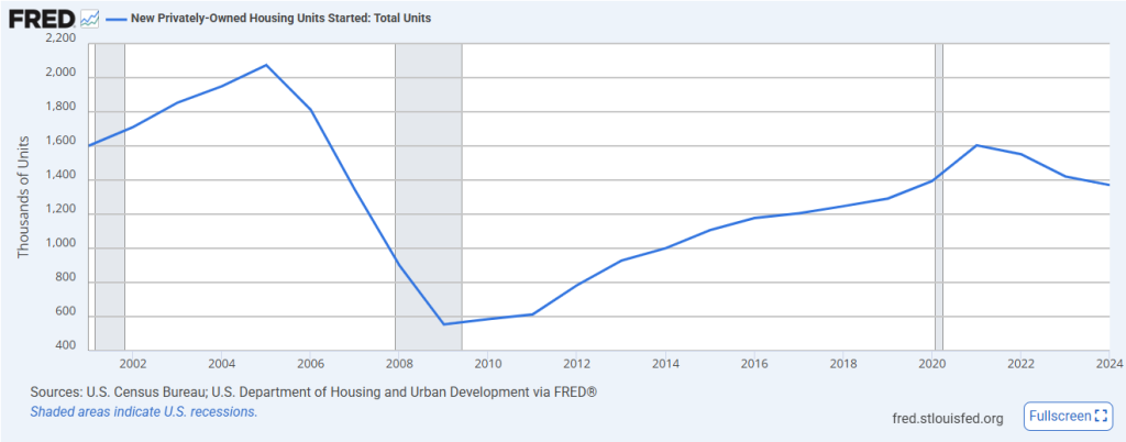 After 2008, however, the ratio fell to a low of 5.4 in 2018 and house prices as a multiple of household income marched up from 4.3 in 2009 to 5.8 in 2022. This slump in the housing stock relative to the population occurred because house building fell off a cliff in 2005, as Figure 3 shows. That year, 2.1 million houses were started in the United States, but this fell to 554,000 in 2009. The number of starts drifted up from there and picked up pace from 2019 to 2021, driving that increase in the housing stock relative to the population and decline in house prices as a multiple of household income since 2022 seen in Figure 2.