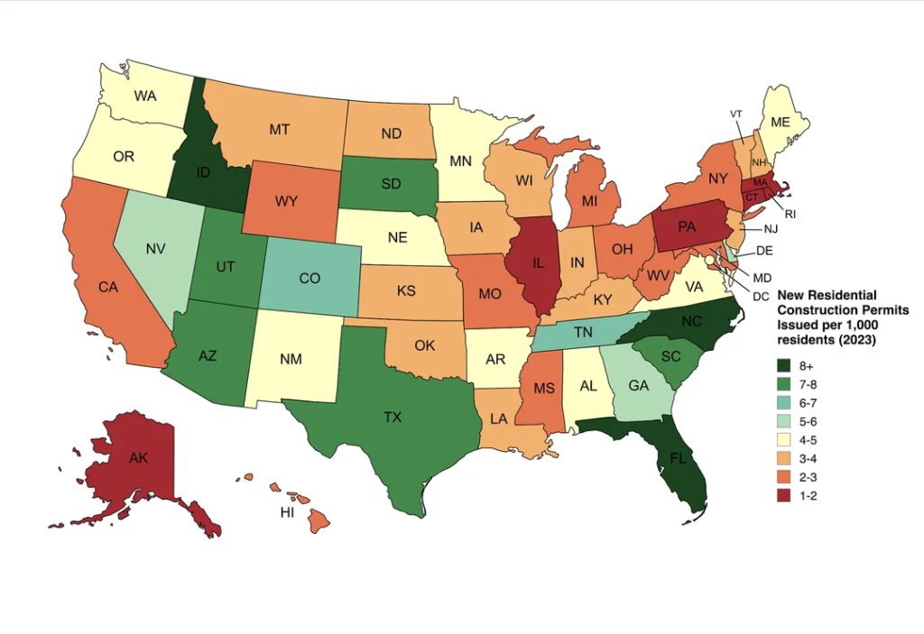 Figure 4 shows that the number of residential construction permits issued per 1,000 residents in 2023 ranged from more than eight in Idaho, North Carolina, and Florida, to between one and two in Alaska, Illinois, Pennsylvania, Massachusetts, Connecticut, and Rhode Island.