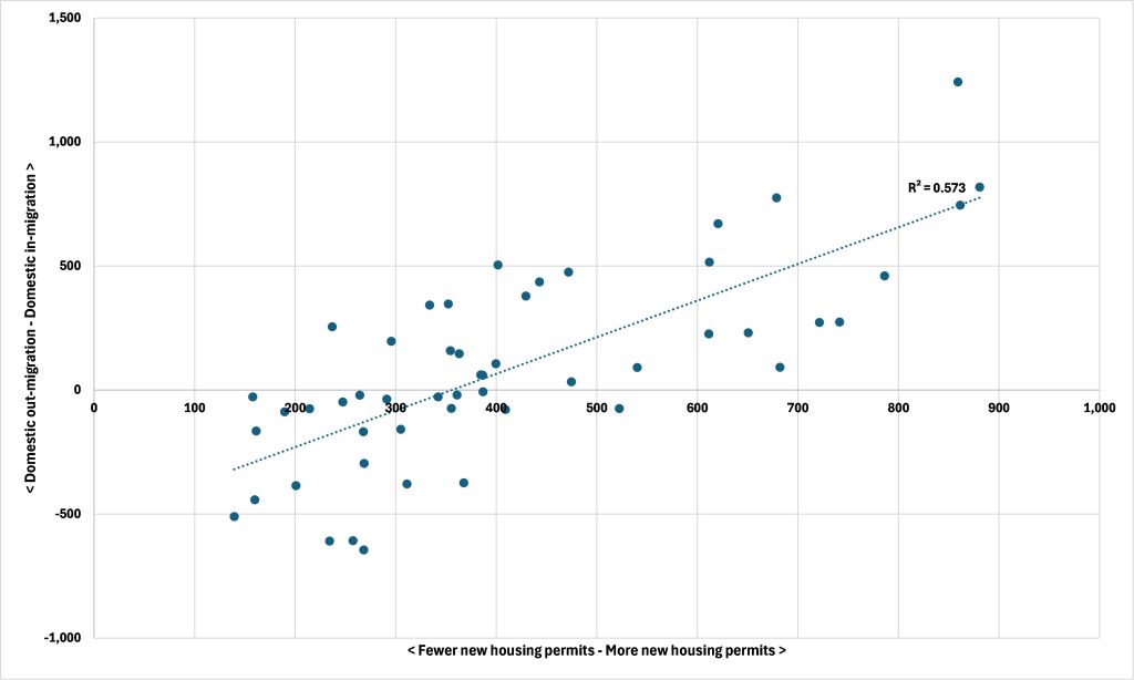 And people move to where they can find a place to live. Using Census Bureau data on population and housing, Figure 5 shows the rate of New Privately Owned Housing Units Authorized per 100,000 residents for 2024 on the x (horizontal) axis and the Net Domestic Migration rate per 100,000 residents for 2024 on the y (vertical) axis. The relationship is statistically significant, and variations in the rate of housing permit issuance can explain 57.3% of the variation in net domestic migration rates in 2024.