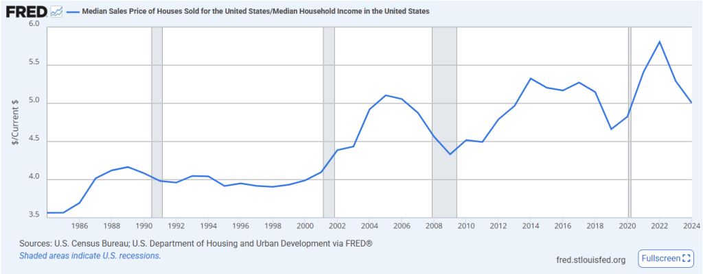 Within this, housing is a particularly pressing concern, and it is easy to see why. There are lots of ways to show this, but, as Figure 1 shows, the median sale price of a new house in the United States has risen from about four times median household income between 1987 and 2001 to an average of about five times since 2013. Given how vital housing is to people, this is a big part of the affordability squeeze.