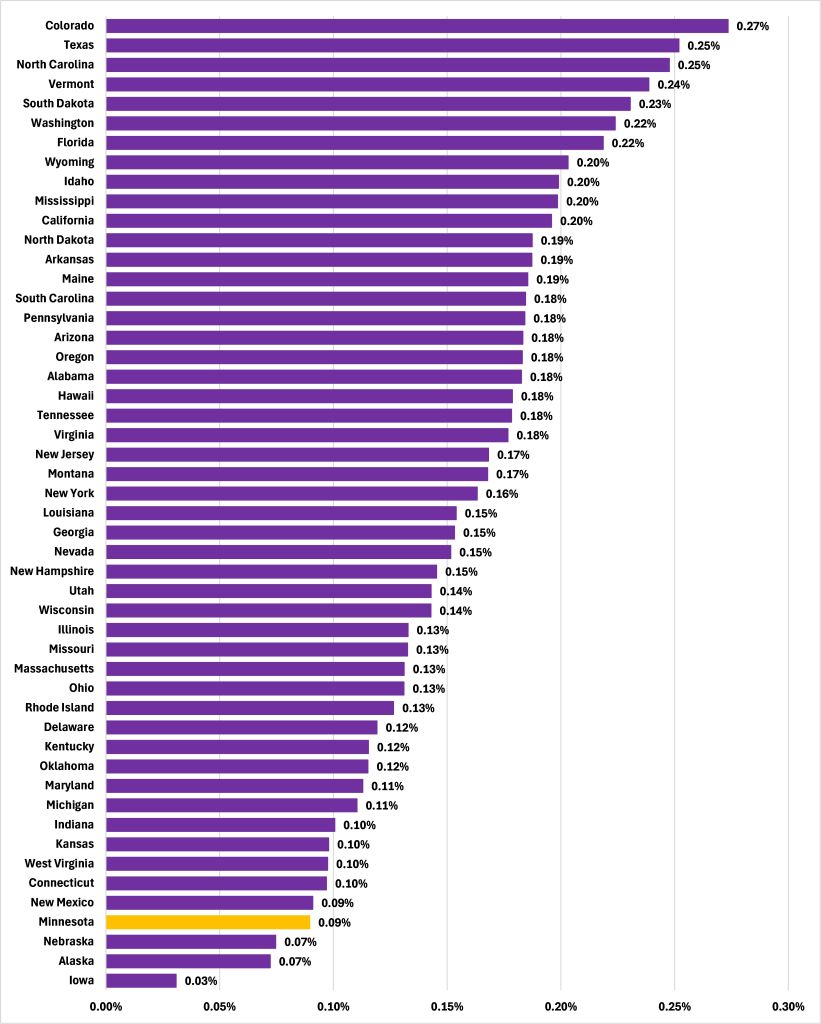 What explains this? That will be covered in a report in the New Year, where I use growth accounting and our estimates of human and physical capital to take a deep dive into Minnesota’s per capita GDP growth. Watch this space.