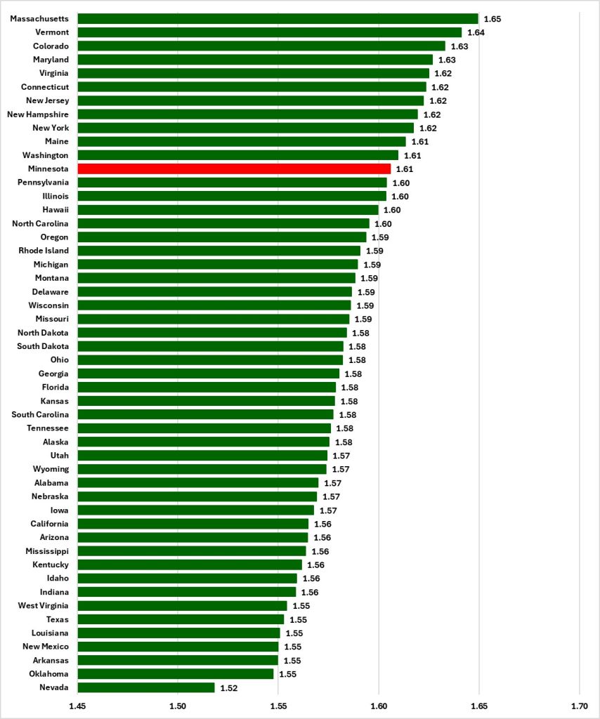 The results of this exercise for 2024 are shown in Figure 1. We see that Minnesota ranks 12th out of 50 states for the human capital per worker arising from education.