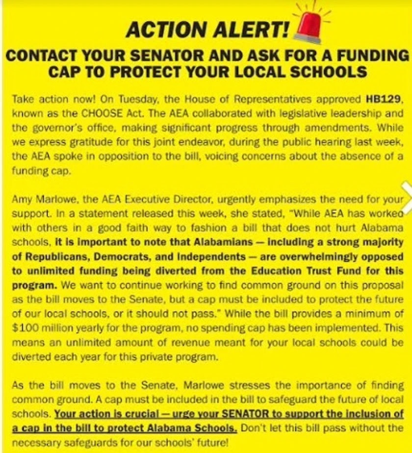 An AEA paid political operative recently took to Alabama airwaves to declare that AEA, despite their clear financial and organizational ties to the liberal National Education Association, is run by “Conservative Republican women”. He also claimed AEA didn’t oppose school choice legislation and that AEA “allowed” the CHOOSE Act to pass the Alabama Legislature in 2024. Yet, Amy Marlowe, AEA Executive Director, even while publicly claiming that they were neutral on the bill, sent an alert to AEA members to demand that the Alabama Senate cap the CHOOSE Act or kill the bill, ”While AEA has worked with others in a good faith way to fashion a bill that does not hurt Alabama schools, it is important to note that Alabamians – including a strong majority of Republicans, Democrats, and Independents are overwhelmingly opposed to unlimited funding being diverted from the Education Trust Fund for this program. We want to continue working to find common ground on this proposal as the bill moves to the Senate, but a cap must be included to protect the future of our local schools, or it should not pass.”