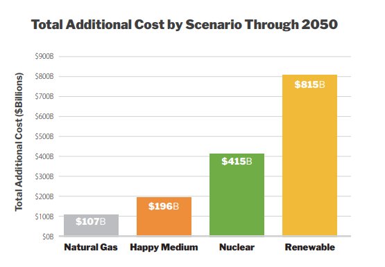 The modeling in the report indicates that complying with the Nuclear scenario will cost an additional $415.3 billion compared to operating the current electric grid without the inclusion of federal subsidies. The Natural Gas scenario will cost an additional $106.9 billion, and the Happy Medium scenario will cost an additional $195.8 billion. The graph below shows each of these scenarios is far lower in cost than the Renewable scenario, which would cost nearly an additional $815 billion through 2050.