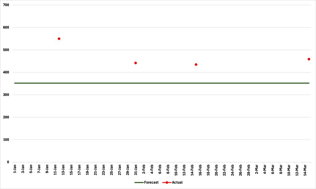 Since it launched, as and when the data have become available, I have been tracking the performance of Minnesota’s Paid Family and Medical Leave (PFML) scheme against the forecasts on which it is based. Back in 2023, a daily rate of approvals of 352 (128,338 / 365) was forecast.