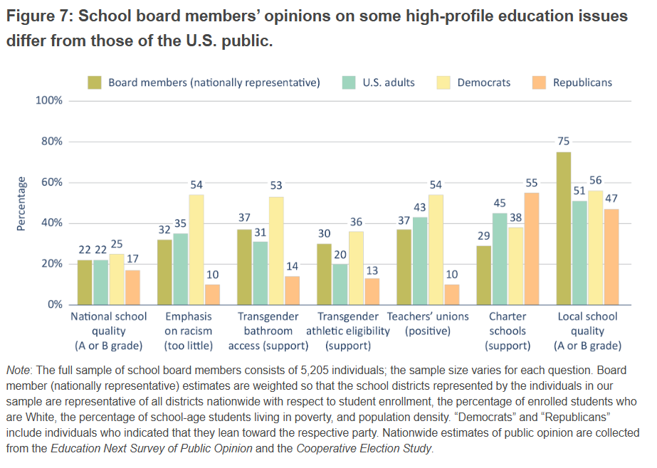 An October 2025 report by the Fordham Institute surveyed over 5,000 board members representing over 3,000 national school districts. Since the United States has over 13,000 school districts (most small, rural, and sparsely populated), this data does not fully represent all board members and districts. The Fordham Institute controlled for this sample with limited representation by weighing the results carefully: you can read about their method here.