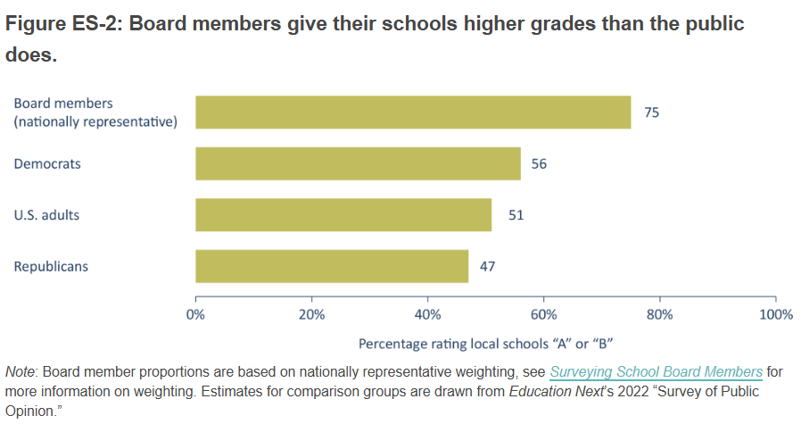 One piece of data was cause for significant concern: there’s a large gap between the public perception of how well schools are doing and how school board members rated their schools. School board members are far more likely to rate their schools higher than their community would rate them.