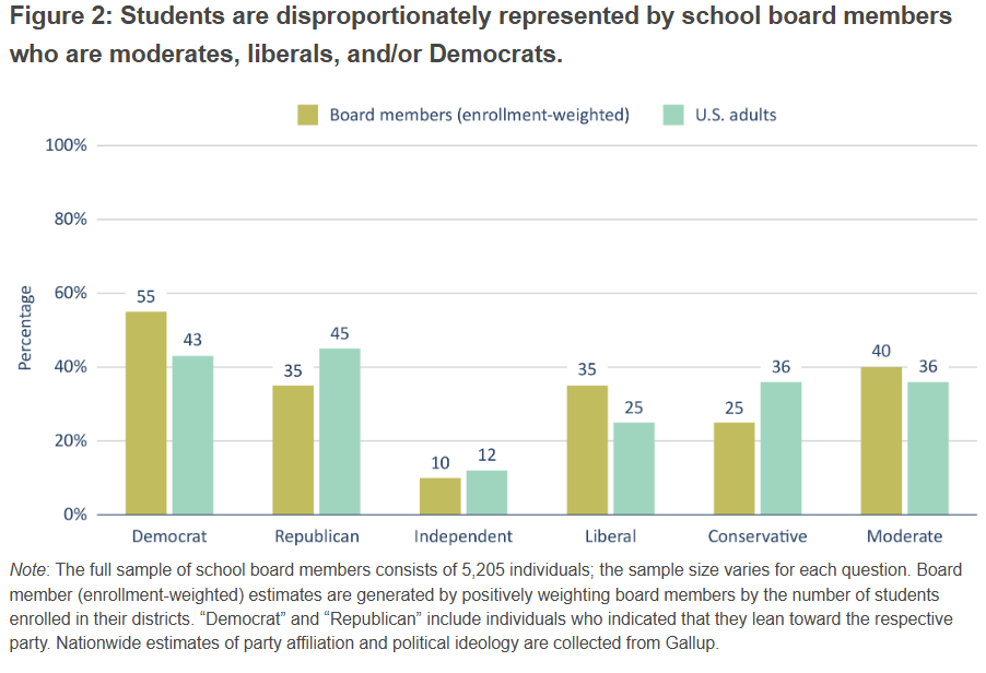 The Fordham Institute found that nationally, school board members’ party ideologies and leanings map loosely onto the US public’s leanings. However, since most students are in urban areas, a high majority of students tend to be disproportionately represented by moderates, liberals, and/or Democrats, who tend to hold urban seats.