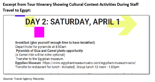 Featuring tourist activities of “debatable value” such as a visit to a South African game park, a hot air balloon ride, camel rides and a visit to the pyramids, 12 of the 15 trips were never submitted for approval. One trip was even rejected by the Office of Finance, but the employees traveled anyway.