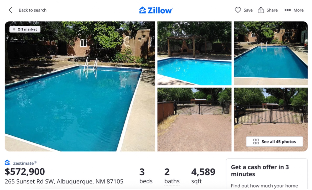 But Zillow provides a glimpse of the residential location. The first pictures listed are of the three-bedroom, two-bath home’s pool.