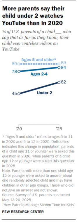 A 2025 Pew Report found that YouTube use by children under two jumped from 45 percent in 2020 to 62 percent in just six years. As a reminder, children usually learn to walk from 9 to 18 months old, and speak from 18 to 24 months. This YouTube usage represents children in a very early, deeply critical stage of development.