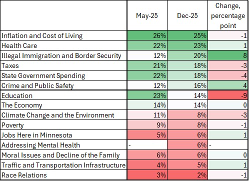 In both May and December 2025, we asked “Thinking about some issues, which ONE or TWO of the following issue areas do you believe should be the top priorities for the Governor and State Legislature here in Minnesota?” As Table 1 shows, “Inflation and Cost of Living” held its position as Minnesotan’s leading concern, so watch out for more from us on “affordability.” But we also see that the share of Minnesotans naming “Illegal Immigration and Border Security” surged by eight percentage points, moving from 7th out of fifteen issues to 3rd. It now ranks as a top three concern in both the “MSP Suburbs” and the “Rest of State.”