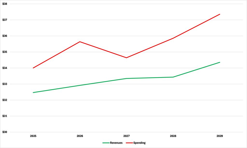 Revenues have increased also, as Figure 2 shows, but by nowhere near enough to fully fund the “trifecta’s” explosion of spending. In 2024 and 2025 combined, revenues came in $2.3 billion higher than forecast in February 2023 which, obviously, was nowhere near enough to cover the $13.8 billion increase in spending. Revenues are forecast to rise to $34.4 billion in 2029, 12.2% up from 2022, but this will not be enough to cover forecast spending; indeed, forecast spending outstrips forecast revenues in every year to 2029 for a cumulative deficit of $11.0 billion, as Figure 3 shows.