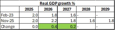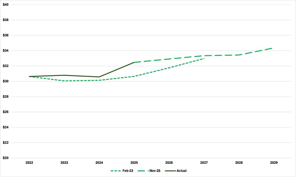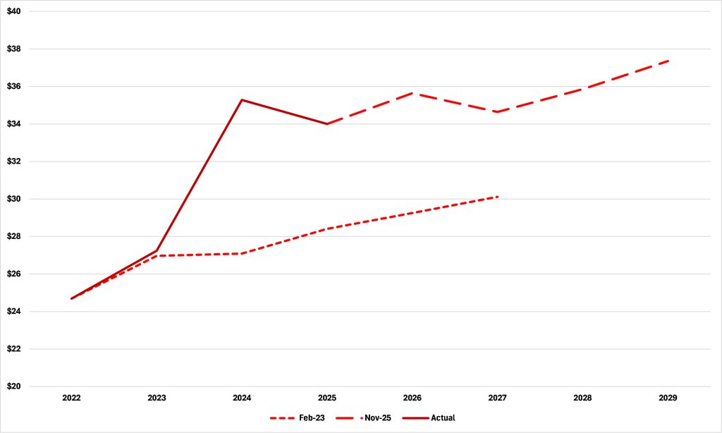 But this doesn’t work as an explanation. As I noted yesterday, “in November 2024, real GDP was forecast to grow by 10.0% from 2024 to 2029 and in November 2025 that forecast is for 9.8% growth…” The alleged economic chaos wrought by the Trump administration which the DFL claims is the source of Minnesota’s budgetary woes isn’t in MMB’s own forecast. Indeed, real GDP growth is now forecast to be higher in 2026 and 2027 than it was in February 2023, as Table 1 shows.