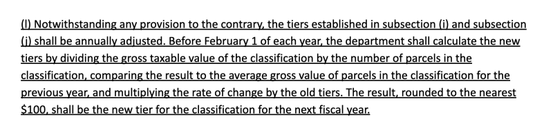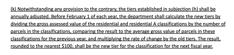 An example of this calculation would be as follows: If the residential A tier were set at $1.3 million and the average gross assessed value of properties in the residential and residential A classes increased by 5%, the tier for the next year would be $1.365 million.