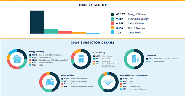 For comparison, 9,167 jobs, or 14.4 percent, are in the realm of “renewable energy generation,” including 5,390 in solar and 2,870 in wind. 2,099 are in “clean storage” grid jobs.