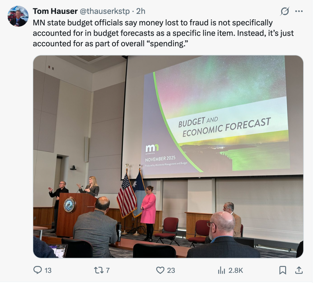 State budget officials had to answer several questions about how they are accounting for fraud in the budget forecast. Their answer was they’re not. “We don’t budget for fraud.” It would be pretty alarming if your state budget office projected a certain percentage of fraud in the upcoming budget, but maybe that’s where we are in Minnesota today. Most of the money stolen from fraud was allocated in previous bienniums so it’s already gone. They did note that savings from shutting down the fraud-ridden Housing Stabilization program is baked into the budget forecast.