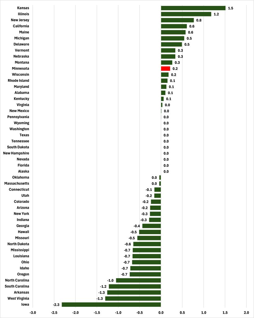 Figure 2: Change in state income tax as a share of Average Annual Pay, 2016 to 2025, percentage point