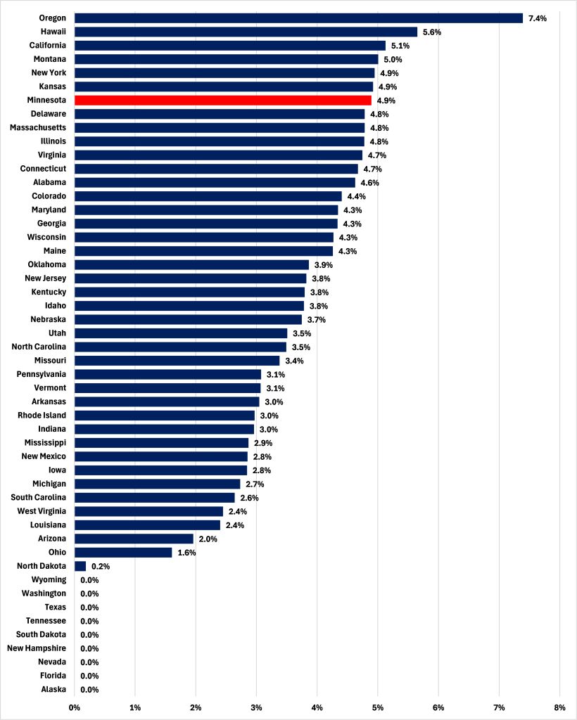 Tomorrow is the deadline for Minnesotans to file their 2025 taxes. When he or she does, the average earning, single filing Minnesotan will hand over 4.9% of their 2025 wages to the state government, a higher share than in 43 out of 50 other states, as Figure 1 shows.