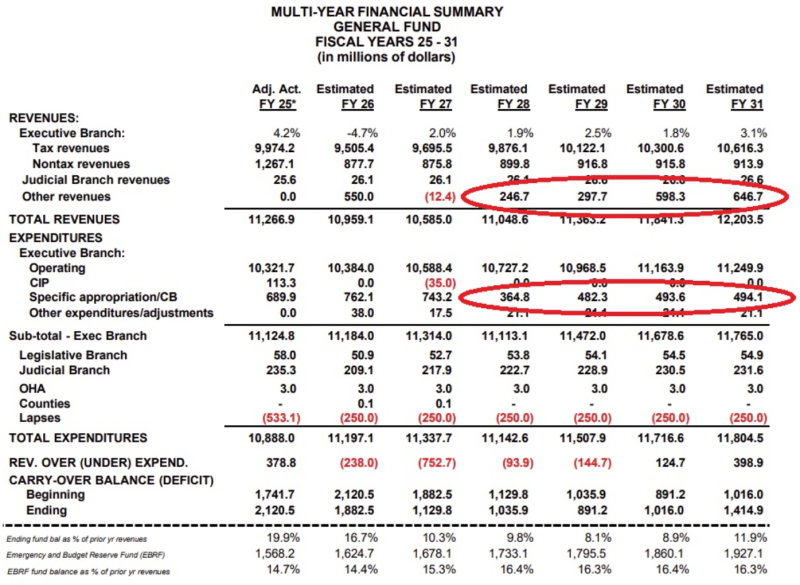 Above, Gov. Green’s state budget for fiscal years 2025 through 2031 showing $1.8 billion of “Other revenues” and $1.8 billion of “Specific appropriation/CB.” Red circles added by the Grassroot Institute of Hawaii.