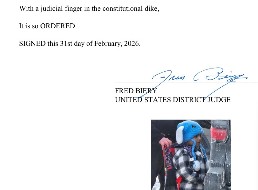 The date on the judge’s order is February 31. Everyone but a Clinton-appointed judge would know that February 31 is a date that cannot exist in the Gregorian calendar. So that renders the order null and void, correct?
