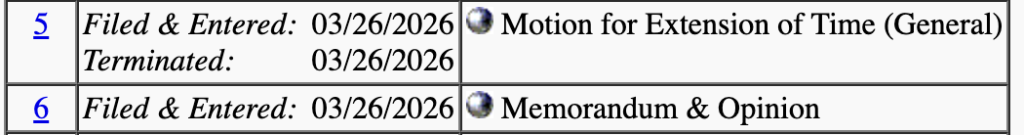 A motion for an extension of time was filed as Document #5, preceding the filing of the Judge’s Opinion (#6). The system does not make public to-the-minute time stamps, so it is possible that the Motion was filed late.