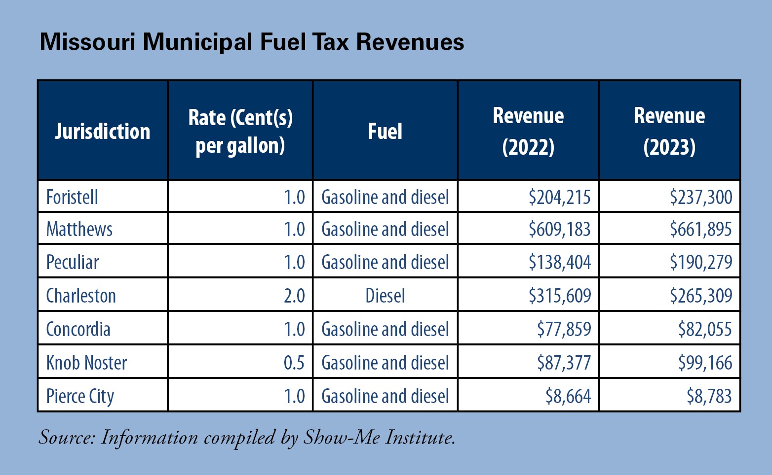 The most interesting tax issue on the Harrisonville ballot is a local gas tax. Local gas taxes are a little-used option for funding roads for municipalities. Harrisonville would be the eighth city in Missouri to enact such a tax for its roads, according to Show-Me Institute research. Not surprisingly, many of these municipalities are located along major highways where people frequently stop for gas. In the same way that Prussia was called “an army with a country,” Foristell and Matthews could be considered truck stops with their own cities.