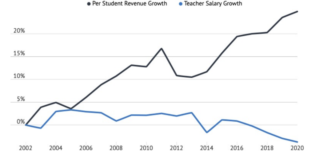 Minnesota fits this pattern. Despite rising inflation-adjusted revenue per student over the last 20+ years, average teacher salaries have declined. According to U.S. Census Bureau data, only about 25 cents of each new education dollar in the state has gone toward instructional salaries.