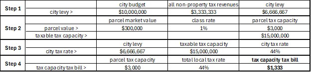 4) [parcel tax capacity] * [total local tax rate] = [tax capacity tax bill]