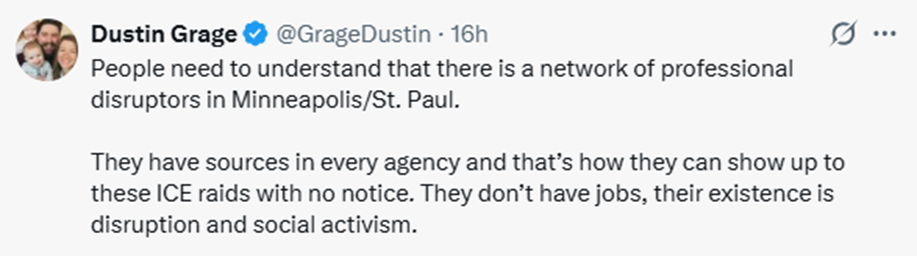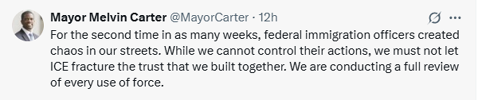 The group’s tactics are to surround agents and block their paths of travel on foot and by vehicle. Video shared on X shows protestors aggressively surrounding and shouting at agents. One video shows Minnesota House Representative Athena Hollins among the group yelling at the agents, while another unidentified protestor screams at the agents calling them “fucking pigs” and demanding that they “get out of here.” Another video shows people blocking the ICE vehicles as they attempted to leave the area – an action that resulted in pepper spray being deployed by St. Paul police officers called to the area because of the threat the group was posing to the ICE agents.