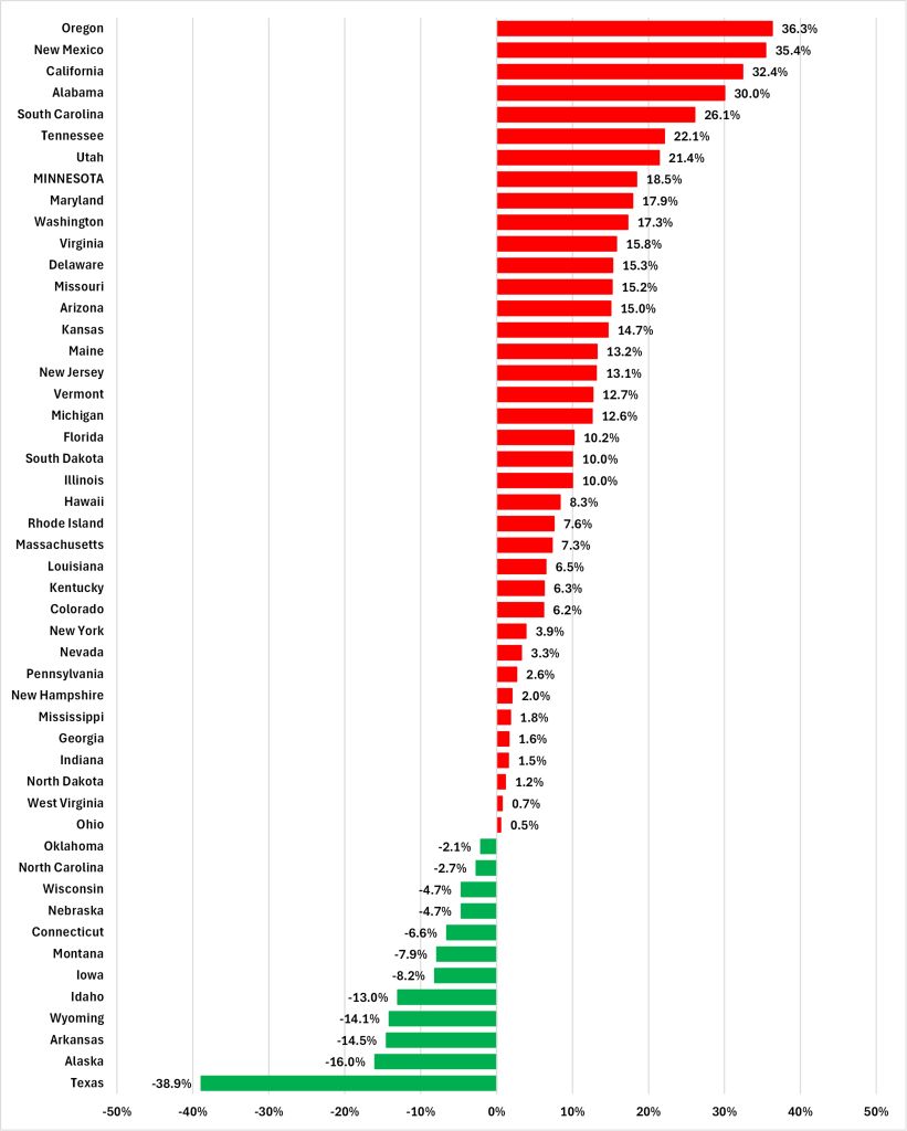 If we adjust for inflation, we can calculate the increase in per capita state government spending over time in real terms. As Figure 2 shows, adjusted for inflation, Minnesota’s level of state government spending per person increased by 18.5% between 2019 and 2025. This was a greater increase than in 42 other states; indeed, in 12 states government spending per person fell in inflation adjusted terms over the same period.