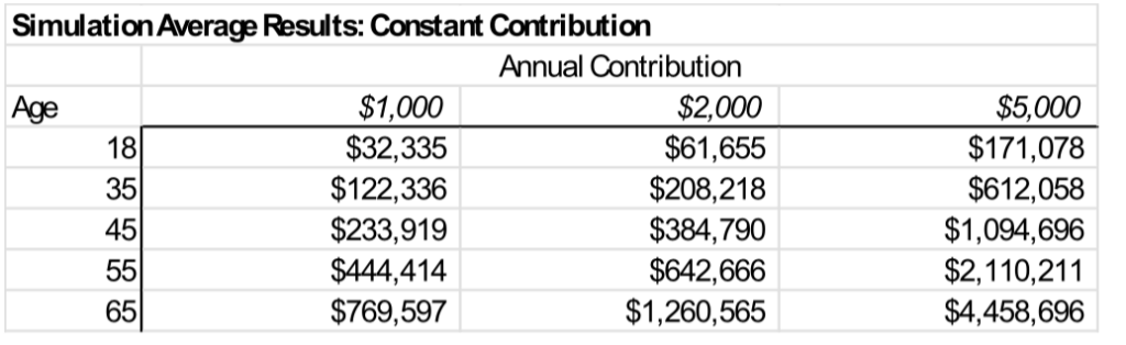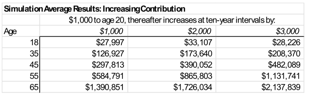 To show the potential of Trump Accounts for lifetime wealth building, I set up a spreadsheet simulation to model potential investment results. I assume investing strictly in an S&P 500 index fund, and I maintain the same annual contribution level for the life of the account holder. For each yearly contribution amount, I ran 100 trials, applying a rate of return drawn at random from historical S&P 500 data: with an average annual real (adjusted for inflation) portfolio return of 6 percent (reinvesting dividends), and standard deviation of 20 percent.