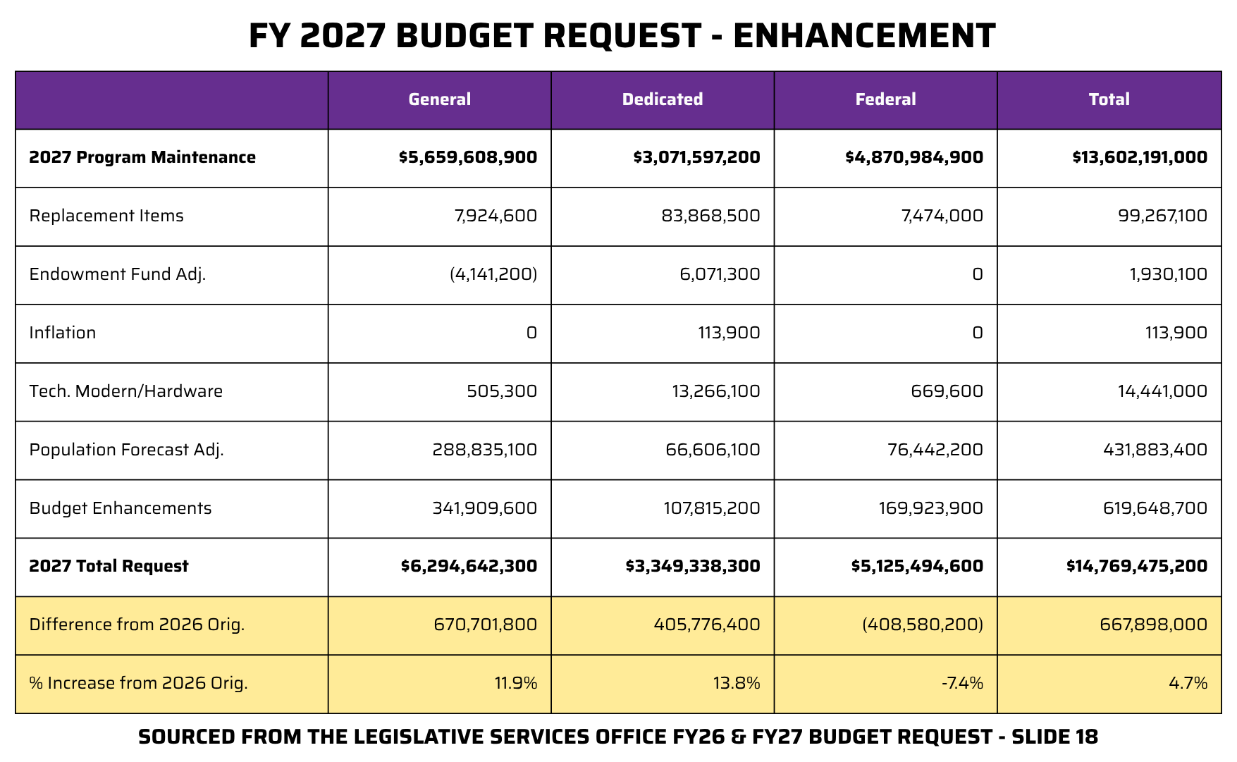Below is a table with the additional items and enhancements that roll up to the total budget request. There are a few things to keep in mind. This comprises the agencies’ requests, and the governor has already asked agencies to go back and make additional reductions. So, these are preliminary numbers.