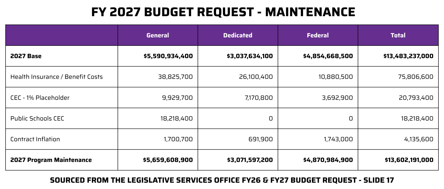 To understand the FY27 picture, let’s look at two tables from the recent Legislative Services Office presentation. The one below is the growth for the maintenance budget from the base. The maintenance budget is to keep the lights on. Two things stand out: