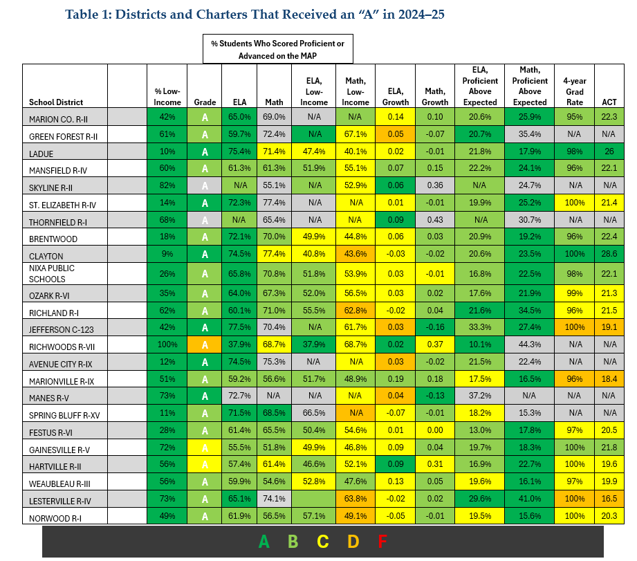 There is a lot more to delve into for academic performance. Table 1 is just one snapshot of what is available on MOSchoolRankings.org. Accountability tools like these can help highlight success stories, identify areas for improvement, and provide a clearer picture of how schools across Missouri are performing.