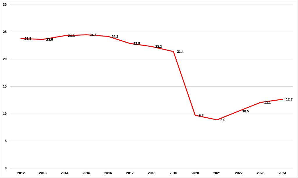 Figure 2 makes the same point. Dividing the total ridership above by the population of the Twin Cities metro to get a figure for rides per capita, we see that this peaked in 2015 at 24.5 and that the figure in 2024 — 12.7 — is down 48% from that peak of Metro Transit use a decade ago.