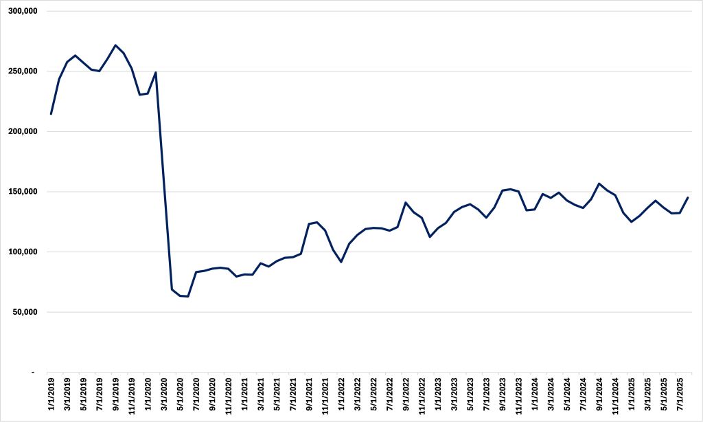 Metro Transit data show that, overall, use of the network collapsed in the first half of 2020 and has yet to recover, more than five years on. In the fourteen months from January 2019 to February 2020 inclusive, average daily ridership came to 249,875. As Figure 1 shows, in the fourteen months to August 2025, the average daily ridership was 139,126, 44% down from the pre-Covid-19 average.