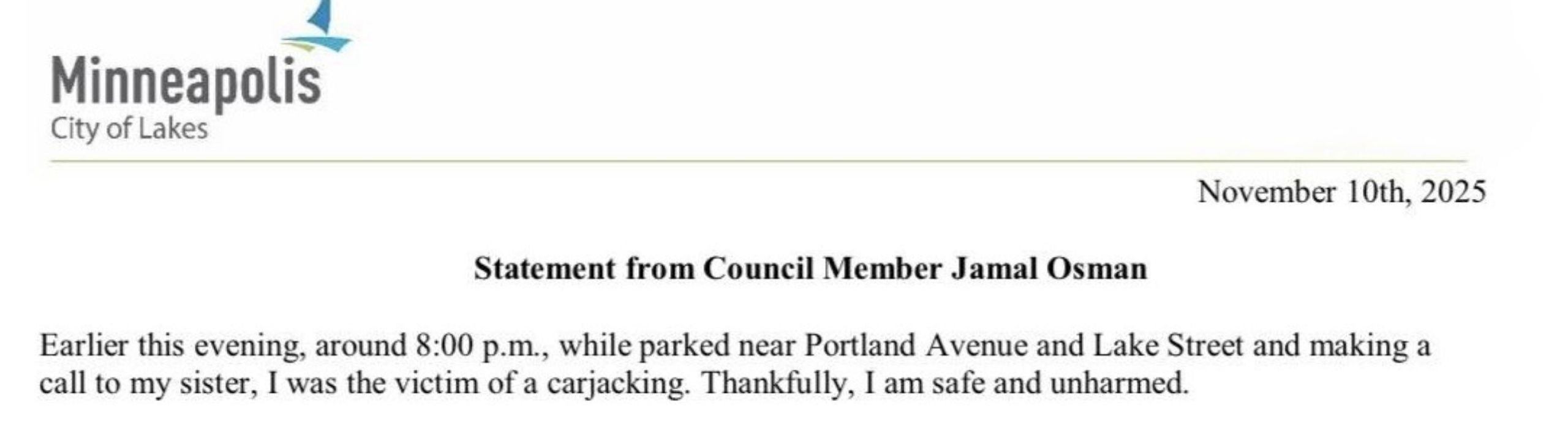 Jamal Osman, Minneapolis City Councilmember representing Ward 6, was car jacked last night in South Minneapolis. There have been few details released, but in a written statement Osman stated that at 8:30 pm he was carjacked while sitting in his car near Portland and East Lake Street which borders his Ward. Osman reported that he was “safe and unharmed.”