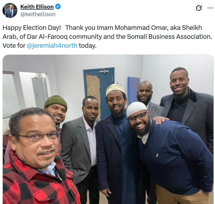 I reported previously that Minnesota attorney general Keith Ellison returned to the U.S. Dept. of Justice a $2,500 campaign donation Ellison had received from Omar. In this 2021 photo taken by Ellison (far left) at Dar Al Farooq, Omar can be seen crouching, 3rd from the right.