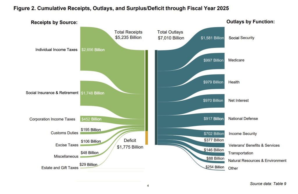 The federal government spent $7 trillion in the 2025 fiscal year but collected $5.2 trillion in revenue, meaning a $1.8 trillion deficit. Entitlements — Social Security, Medicare, Medicaid, and other benefits—  accounted for half of all spending. Interest payments took another 14 percent, and defense was 13 percent of the budget.