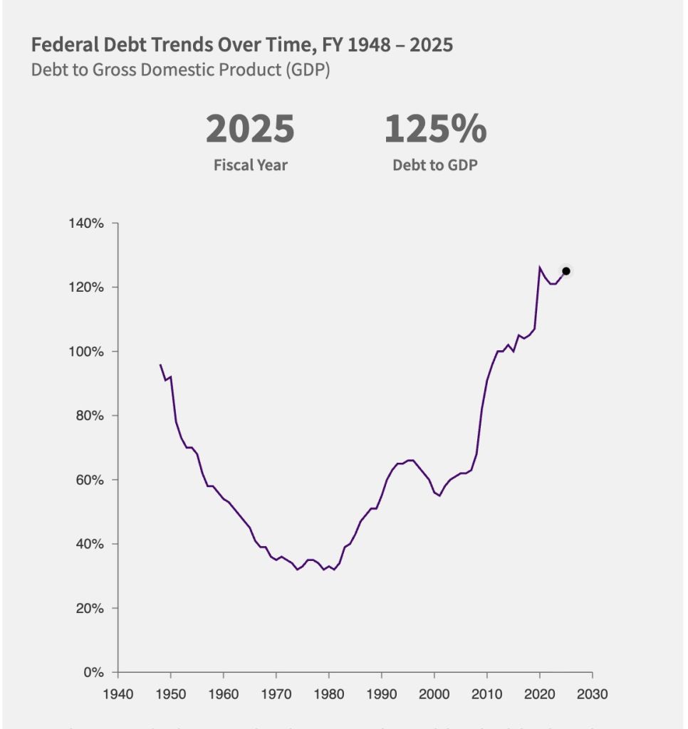 At the end of the 2025 fiscal year — October 2024 to September 2025 — debt reached $37 trillion or 125 percent of the size of the U.S. economy. This is the highest level in history, surpassing World War 2 levels when debt surged to 106 percent of GDP. Excluding debt held by other government entities, debt held by the public reached 100 percent of GDP.