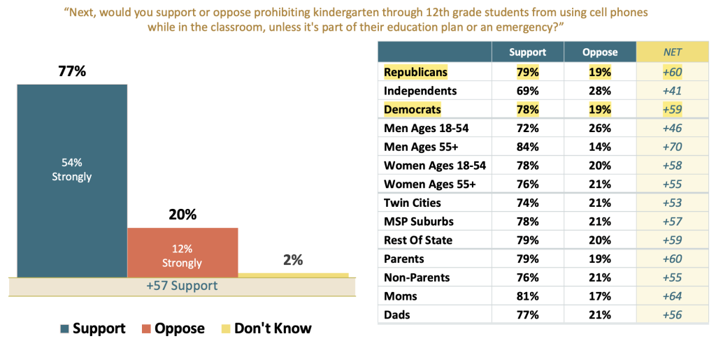 According to American Experiment’s December 2025 Thinking Minnesota Poll, 79 percent of Republicans and 78 percent of Democrats support prohibiting K-12 students from using cell phones in the classroom, unless it is part of their education plan or an emergency.