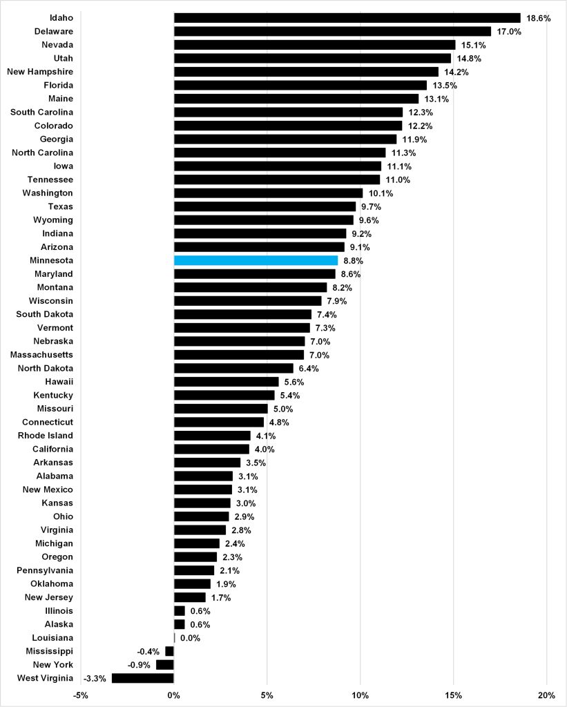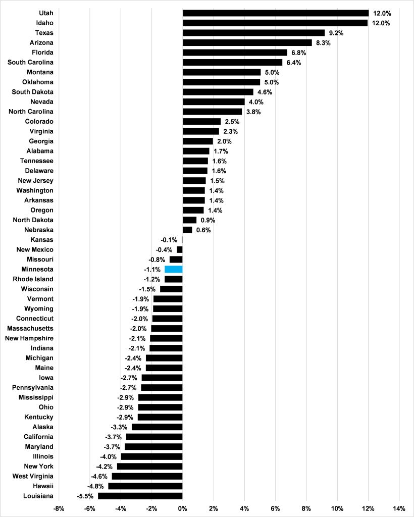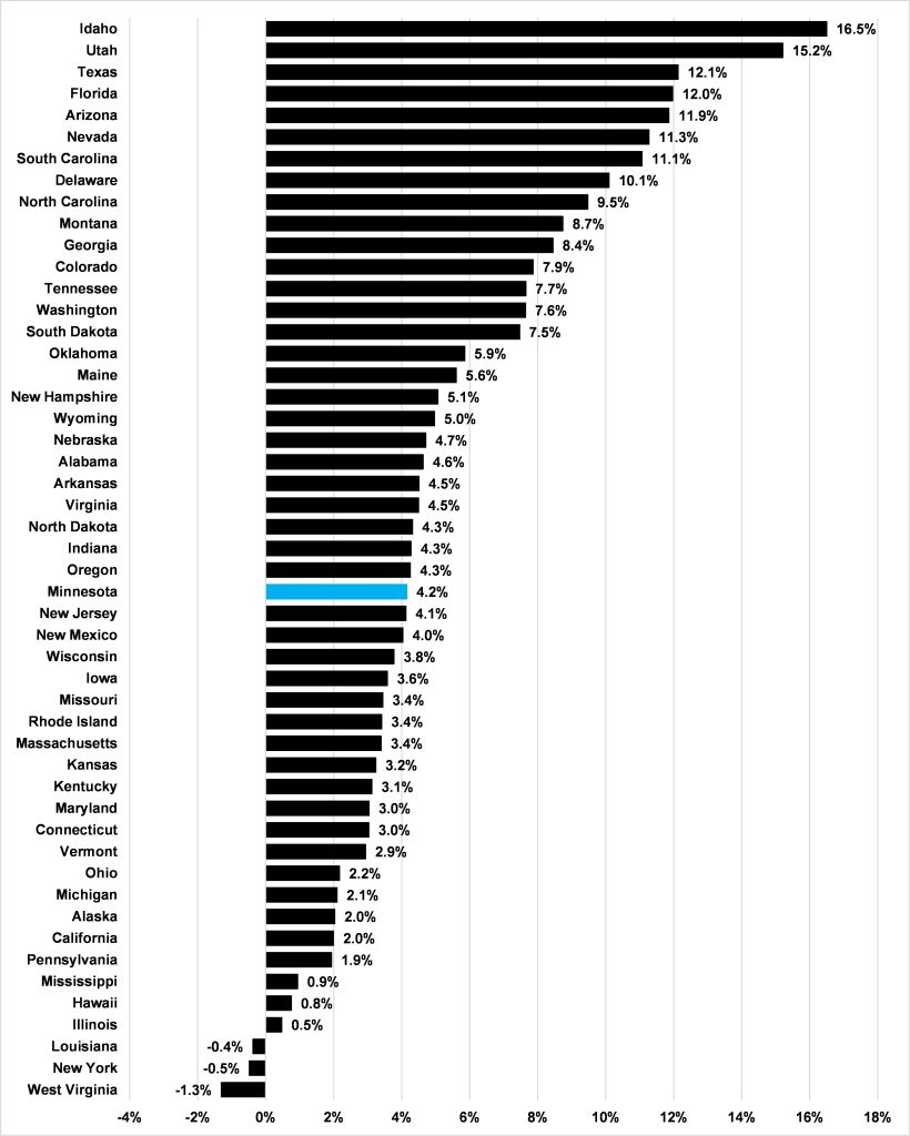 Figure 3 shows that, over Gov. Walz’ time in office (2018 to 2024, the most recent year for which data are available), the civilian non-institutional population in Minnesota grew by 4.2%, faster than in 23 states, and slower than in 26 others.