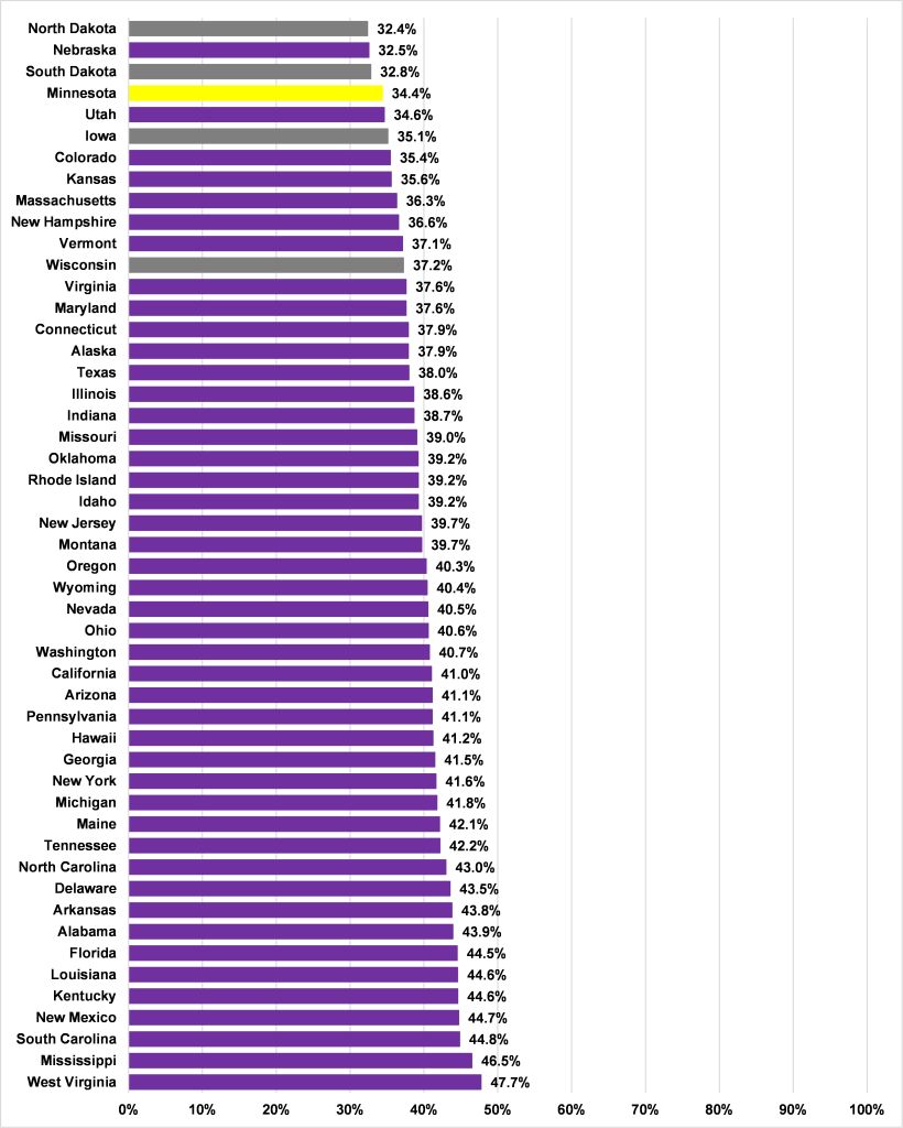 These rates vary widely across the United States, as Figure 2 shows, from 47.7% in West Virginia to 32.4% in North Dakota. Despite their varying state economic policies, Minnesota and its neighbors all score relatively well on this measure, suggesting that something else is driving them, at least to a large degree.
