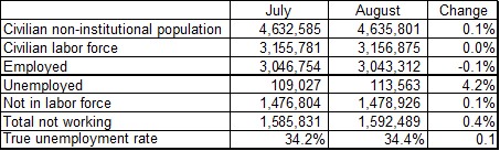 But Table 1 shows us other things, too. We see that the number of Minnesotans actually employed edged down by 0.1%. We can also see, by subtracting the number of people in the labor force from the number in the civilian non-institutional population, the number of Minnesotans who are not in the labor force at all: 1.5 million. If we add them to those counted as unemployed to get a measure the total not working and divide that by the civilian non-institutional population, we get a “true” unemployment rate of 34.4%.