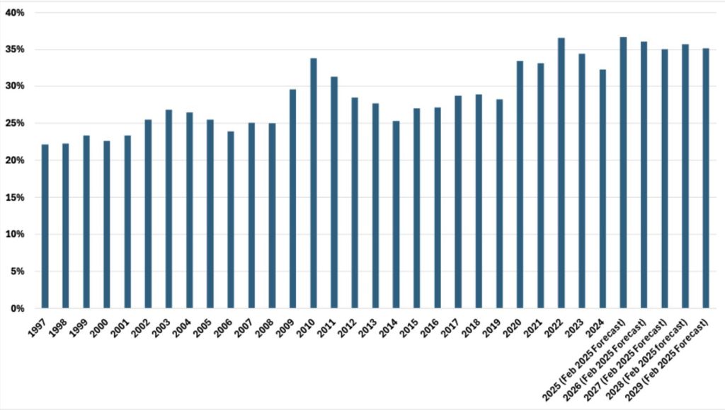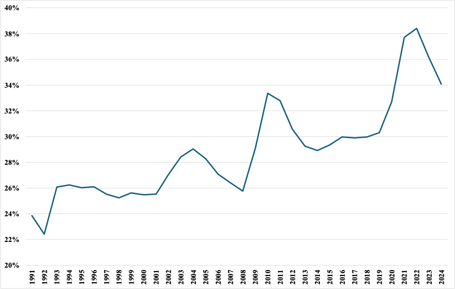 According to the National Association of State Budget Officers (NASBO), federal funds, on average, accounted for over a third of all state expenditures in 2024. While down from the pandemic years, this is among a historic high.